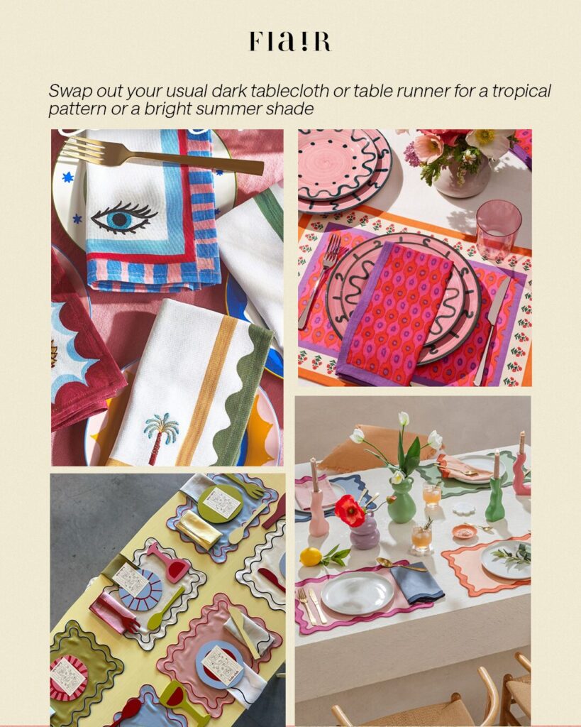 In the dining room, trade dark tablecloths and runners for something lighter. A tropical print, a citrus-hued fabric, or crisp white linens can give your table an inviting summer feel.