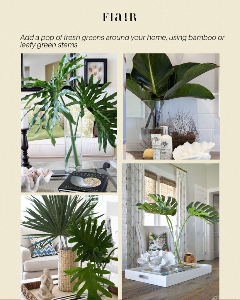 Bring nature indoors by adding leafy green stems or bamboo branches in simple glass vessels. The touch of green brings instant freshness to your space.