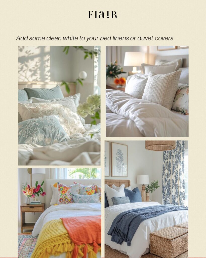 In the bedroom, switch to soft white linens or light duvets. The clean palette not only cools down the room visually but also creates a calming retreat for summer nights.