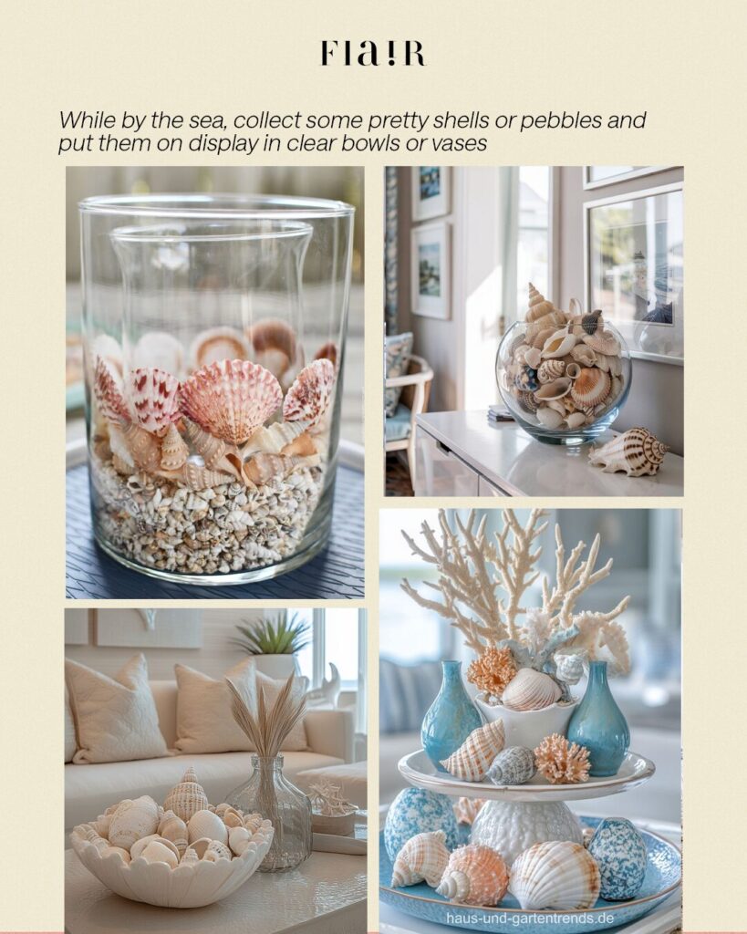 And finally, embrace coastal elements by collecting shells, driftwood, or smooth pebbles during beach escapes. Display them in clear bowls or glass vases to bring a subtle seaside charm into your home.