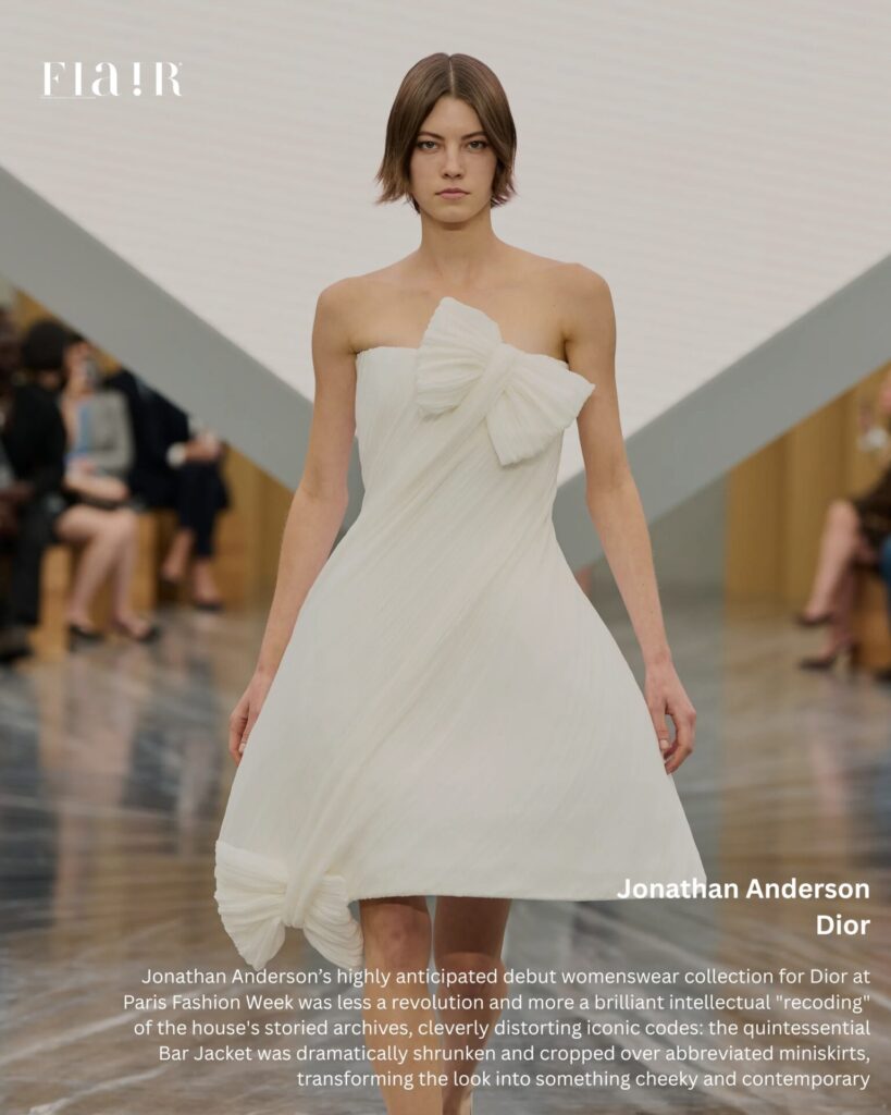 Jonathan Anderson’s highly anticipated debut womenswear collection for Dior at Paris Fashion Week was less a revolution and more a brilliant intellectual “recoding” of the house’s storied archives. Anderson, the first designer since Christian Dior himself to oversee men’s, women’s, and couture, presented a collection built on the “tension between dressing up and reality.” His vision cleverly distorted iconic codes: the quintessential Bar Jacket was dramatically shrunken and cropped over abbreviated miniskirts, transforming the ‘New Look’ into something cheeky and contemporary. Alongside commercial pieces like denim minis and chic capes, Anderson included fantastical elements such as theatrical bows, “double balloon” skirts that riffed on 18th-century panniers, and surreal hats, successfully merging the intellectual artistry he honed at Loewe with Dior’s inherent drama to signal an exciting, complex new era for the French powerhouse.