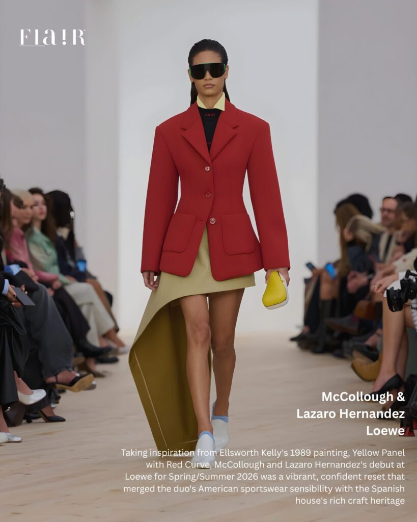 Jack McCollough and Lazaro Hernandez’s debut at Loewe for Spring/Summer 2026 was a vibrant, confident reset that merged the duo’s American sportswear sensibility with the Spanish house’s rich craft heritage. Taking inspiration from Ellsworth Kelly’s 1989 painting, Yellow Panel with Red Curve, the collection was a study in bold, elemental colors and sculpted forms, showcased in items like deliberately rigid leather mini dresses and jackets that held a fixed hourglass shape. Beyond the architectural ready-to-wear collection, they introduced the new Amazona 180 bag, signaling a pragmatic yet artful new chapter for the brand.