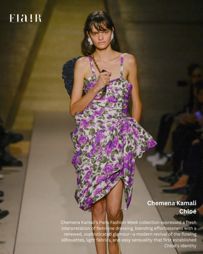 With the recent appointment of Chemena Kamali, Chloé was poised for a fresh chapter at Spring/Summer 2026 Paris Fashion Week. Kamali’s arrival signaled a decisive return to the house’s quintessential codes, with her vision rooted in the brand’s signature bohemian and romantic aesthetic. The collection expressed a fresh interpretation of feminine dressing, blending effortlessness with a renewed, sophisticated glamour—a modern revival of the flowing silhouettes, light fabrics, and easy sensuality that first established Chloé’s identity.
