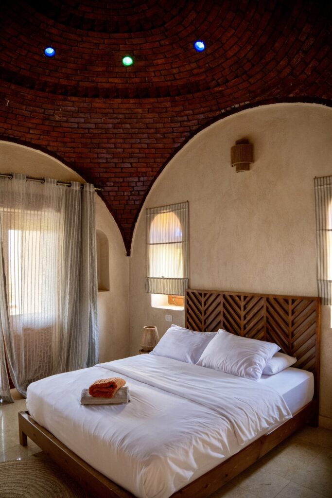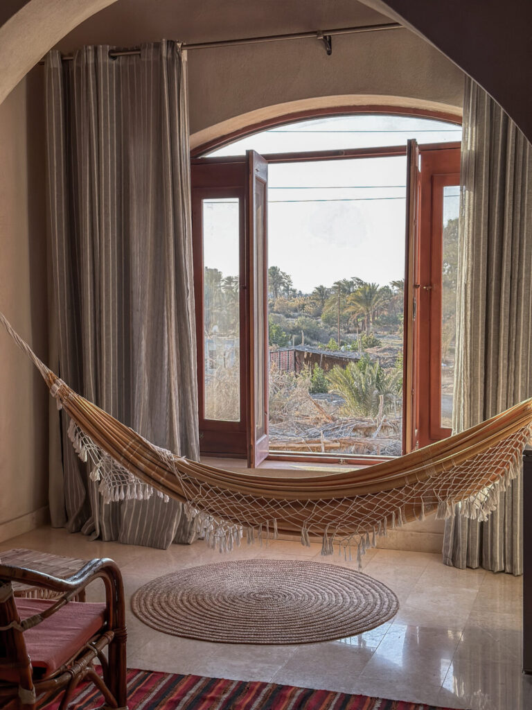 In a small tucked away alley in Tunis village lies one of Egypt’s best-kept secrets (in my humble opinion)– Dar Bulbul B&B. Run by longtime couple Sarah and Fady, this 6-room escape is both charming and luxurious in its comfort and warmth. With handmade touches amassed from multiple expeditions– vintage doors, old Egyptian tile– the luster and beauty of this place is hard to describe, you have to see it in person. Our first visit was straight out of Covid in 2023, when they had just opened, and we have been dreaming about going back ever since. Enjoy a relaxing sunset on the roof overlooking Lake Qarun, or a warm cup of Sahlab by the pool as you jab away to your girlfriends while relaxing beneath the clear night sky.