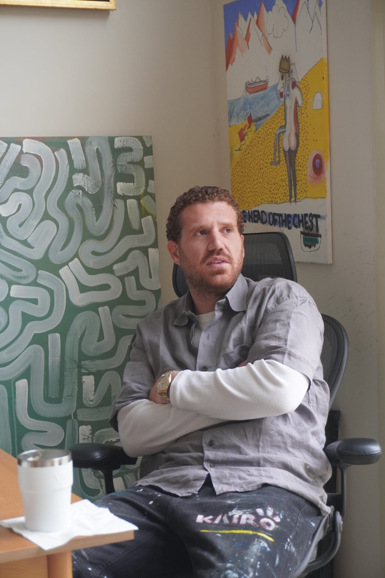 “Music is a part of my life, and– I believe–any artist’s life. It moves us. Even those who don’t actively listen to music, love the sounds of nature: the wind, the breeze, the birds, the leaves. When I came to the studio one of the first things I saw was a live concert happening here,” he gestures to the corner beneath his array of painted canvases, with the floor-to-ceiling glass doors letting in the afternoon light.