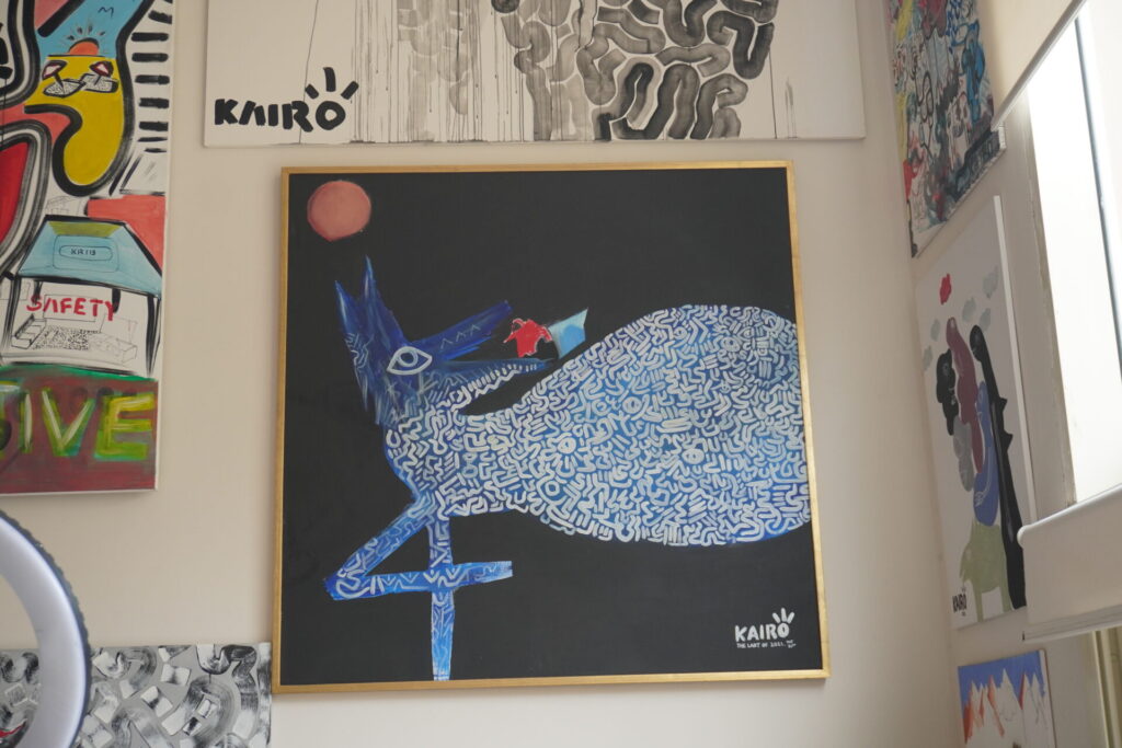 “You can tell a lot by a person the way they draw a line,” he instructs me into a painting secret he learned from a professor. The topic is Keith Haring, the American pop-artist to whom his work has frequently been likened, due to their penchant for doodle-like squiggles and graffiti flair. However, Kairo maintains that he does not really consider Haring as one of his influences: