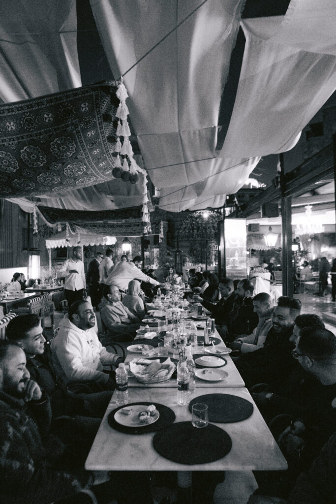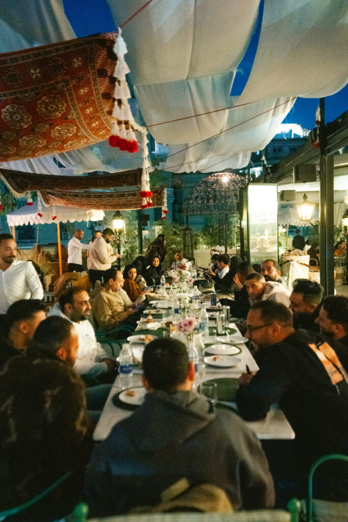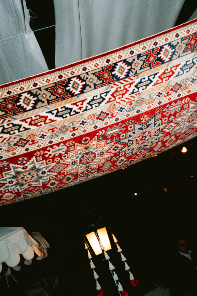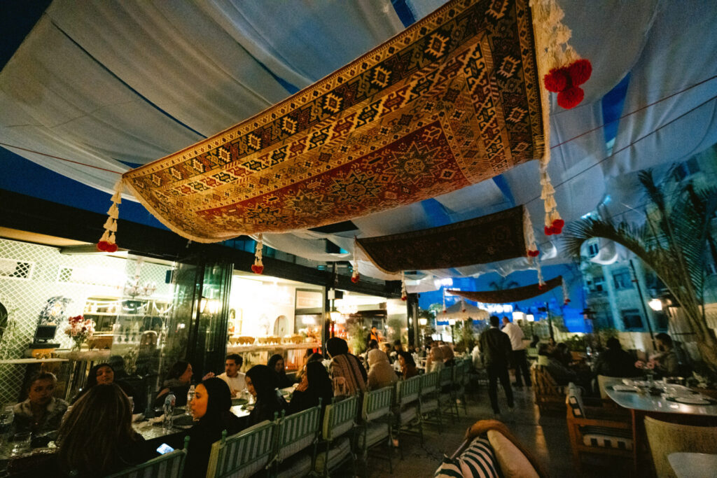 Suspended above the restaurant’s rooftop majlis, three handcrafted Kahhal rugs appear to float above guests gathering each evening for iftar and suhoor. The installation turns traditional woven textiles into a suspended architectural gesture, transforming the dining space into an immersive setting where heritage craft meets contemporary design.